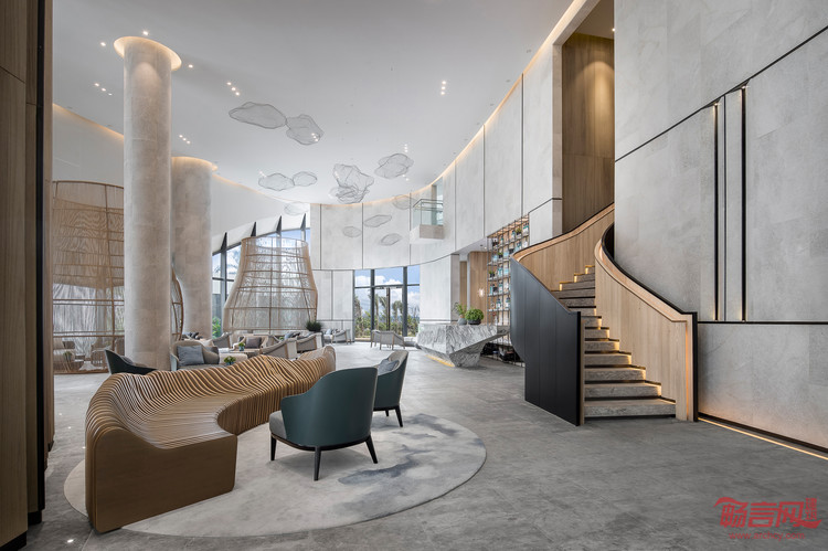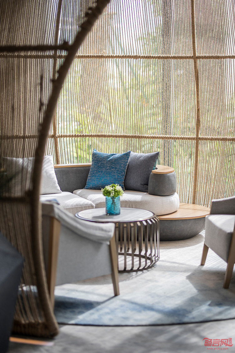 空间中大量运用圆弧形的线条,灵动而优雅。延绵不绝的流动线条恰如三亚柔美的海岸线,亦呼应了建筑的外观特色。