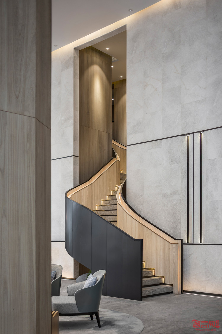 富有雕塑感的楼梯外观被漆成暗黑色,与原木色的相搭,进一步演绎空间行云流水般的自在风韵,阶梯间点点灯光的衔接,也从细微之处看到设计师探索自然、融于艺术的初衷所在。除此之外,大面积绿植被置于空间当中,立足于长远的生态性原则且有氧低碳生活的理念引导。