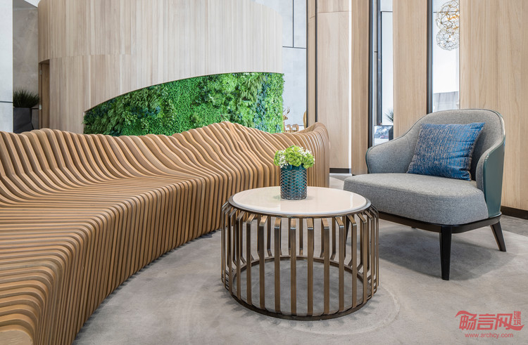 地毯延续灰色地面,视觉上空间得以延伸,恰好与座椅的质感形成一致,连续性的木质波浪座椅如涌动的波浪,引人遐想之余也呼应了整体的基调。