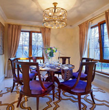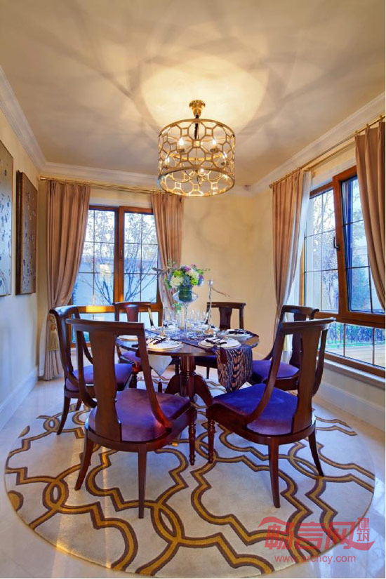 餐厅放置圆形餐桌,设计以黄色、深咖及哑金为主色调,以紫色及木作为点缀,加上少量金属质感的介入,提升了整个空间气质。风格化的铜质吊灯与地毯交相辉映,实木餐桌与紫色绒面餐椅完美融合,制作出主人日常精致的生活场景,独具匠心。