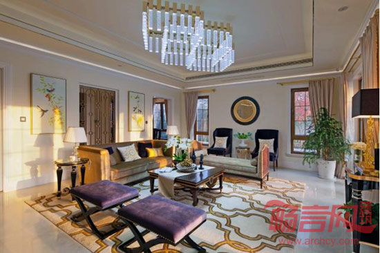 一层为敞阔的英式会客厅,客厅宽达2米的巨型水晶吊灯,宽大的沙发和几案,随处安放的欧式风格摆件、挂画,墙面装饰镜经过色彩和线条处理后,与经典的拼花地毯相呼应,英式的优雅与精致在所有的细节上的用心显得更加到位,气韵自然流转。