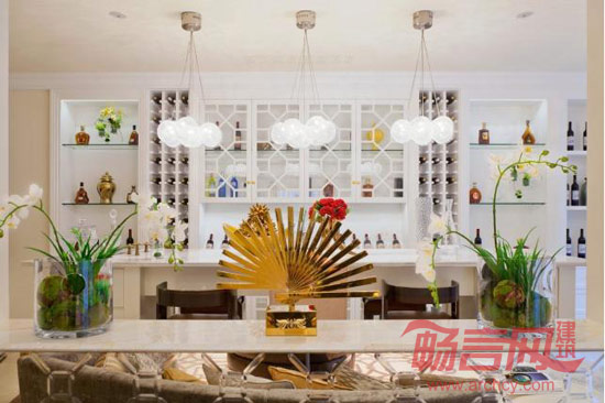 品酒区与家庭室相连,设计在复古中建立一种明朗干净的现代审美,以白色为基调,轻盈的吊灯,精美的杯盏和花艺,无不体现主人深厚的艺术文化内涵及精致的生活品味。
