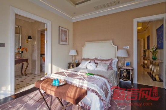 相对于公共空间,私密的卧室设计更加注重营造内心与情感的交流与对话。主卧位于二层,简练直挺而富有生命悦动感的迷人线条,奢华的帷幔和舒适的床品面料,香槟色柔和魅惑,经典与现代的交织。