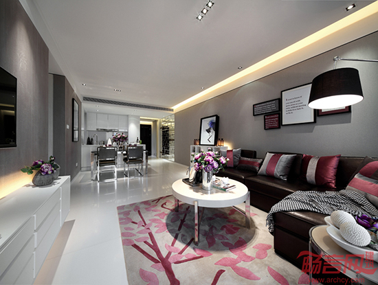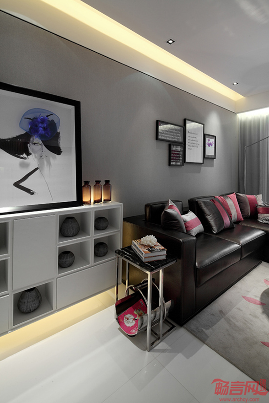 灰白黑的搭配是永不过时的经典色,但是加入些许亮粉色则会出现神奇的化学反应。以纯白色为底色,白色的地板和家具,配以灰色的墙面,黑色的沙发和黑色的画框,使整个空间视觉上扩张放大,显得洁净而柔和。粉色元素的地毯和抱枕点缀其中,并不显突兀,反而调和了黑白色的单一性,瞬间令整个空间变得极富温情,活泼而有趣味。