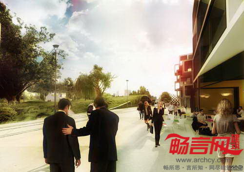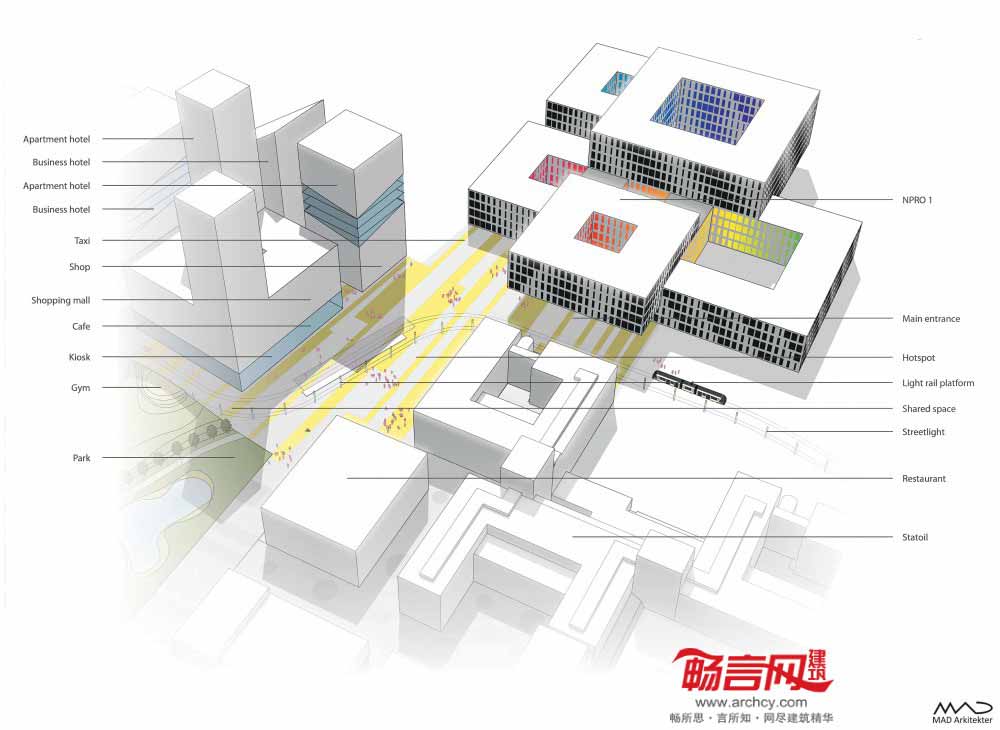 Destination Forus项目由MAD建筑事务所设计,旨在运用清晰、稳健并高效的总体规划将场地打造成专用商业区,无论在形式或功能方面,都与周边建筑风格有所差别。场地两侧风格截然不同,一侧体现了建筑密度和城市化风格,另一侧则是Forus公园的空旷性。可持续的商业开发包括良好的住宅区、高效的基础设施、丰富的野生动物种类、农业区、森林与绿地,所有元素共同营造了一个具有强烈识别性的区域。