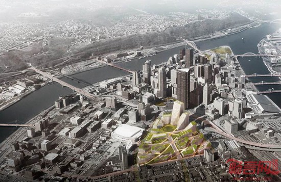 BIG事务所和WEST 8以及Atellier Ten公司合作,共同完成美国匹茨堡占地28英亩的规划方案。项目涵盖1200套住宅以及超过100万平方英尺的零售商业空间。设计旨在提供面向匹茨堡所有地形的可达性,创造供市民使用的活力型开放空间。BIG受托在Low Hills区设计住宅和公共空间。项目建成后将横跨Consol能源中心,将市中心、上城和Low Hills其他区域连接起来。