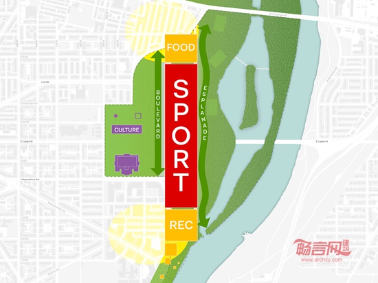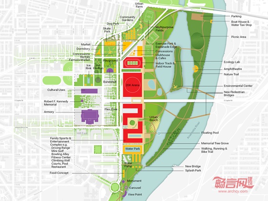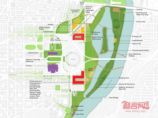 OMA公布了两种肯尼迪纪念球场重新开发方案。肯尼迪纪念球场占地190英亩,位于华盛顿特区。重新开发的目的在于“利用华盛顿特区的滨水区,提供社区服务设施,并将球场与周围生机勃勃的绿色空间、丰富的娱乐场地和充满自然风光步行道联系起来。