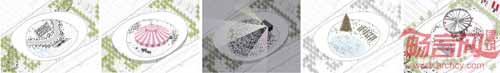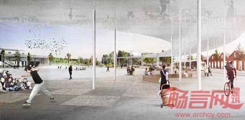 一个倾斜的圆环结构连接了新的交通中心和公共空间,同时也提供了遮阳避雨的场所。多样性的娱乐休闲设施参考了纽约中央公园的设计,方便亲密、灵活、露天大型活动的开展。场地中央广场配有喷水池,游客能在炎热季节感受到丝丝清凉。