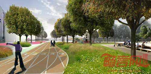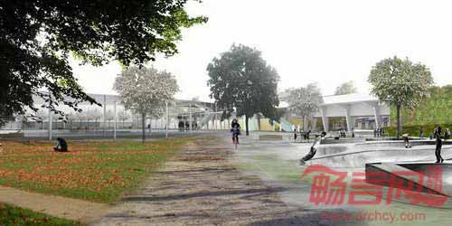 临近圆形中心规划设立一个溜冰场,周边是通道、绿色树木和植物区。场地的休闲主题在公园一侧的田径场继续得到了体现。公共空间则为人们提供了聚会和庆祝的场地,将周边居民和游客吸引到休闲项目之中。