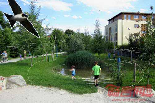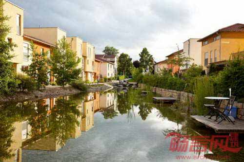 Arkadien Winnenden原本是德国斯图加特郊区的一个厂区,现在被改造成风景优美的生态住宅村。项目于2012年春季完工,项目包涵公园、花园和雨水回收的水景,提供了具有可持续性的廉价住宅。