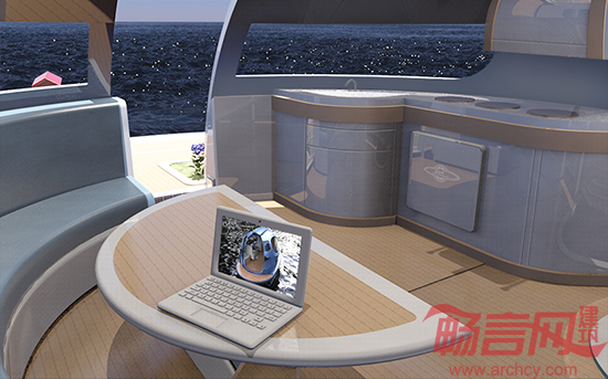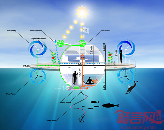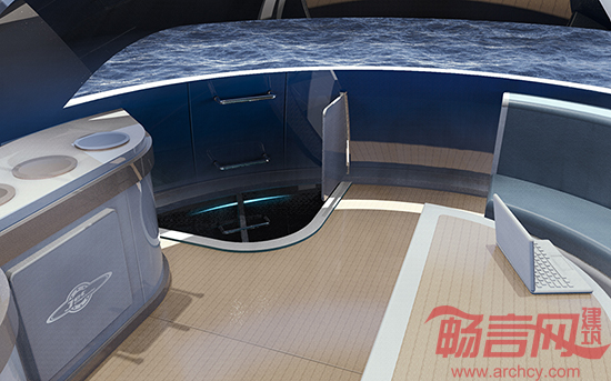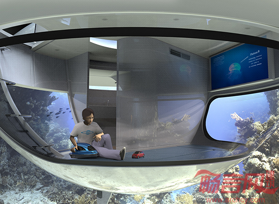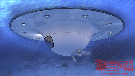 这艘水下“UFO”直径为12.5米,使用了各种系统来充分利用自然元素。除了外层甲板以外,其包括两个可居住区域。一层为厨房,下面一层为浴室和水下观景区。
