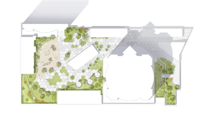 开放的花园区域左侧有一个可以赤脚进入的入口空间,该区域由不同高度的小蜂窝堆砌而成,既是一个适合安静阅读的空间,也是适合孩子们玩耍的地方。
