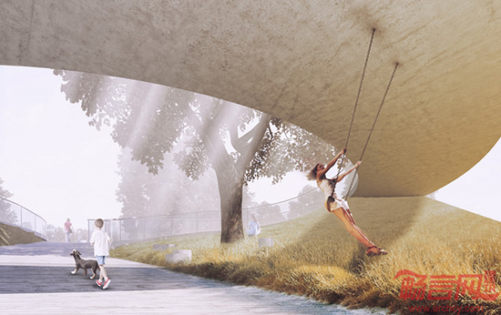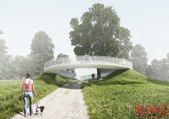 建筑设计公司为瑞典斯德歌尔摩的耶而费拉公园设计了一条螺旋式的人行道。与通常设置在景观旁边的常规人行道不同的是,这条人行道有一个被抬高的环形段,而这个环形段的位置恰好是公园景观的焦点位置。