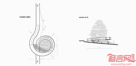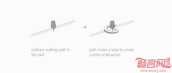 螺旋式扭曲的通道形成了一个人行天桥,而天桥下方还有一条通道,通道两边各有一座假山支撑着天桥。这个环形一方面提供了另外一种组织行人交通的方式,另一方面也起到了将行人注意力吸引到自然景观的作用。