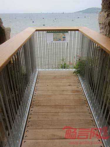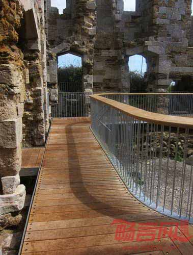 Sandsfoot古堡位于英国多赛特郡,一直遭受海岸侵蚀,自1930年代就对旅客安全造成威胁。伦敦Levitate工作室受委托实施保护改造工程,目标是使古堡重新向游客开放。项目设计了一条轻型走道,嵌入古堡遗迹的内部空间。走道沿着遗址墙壁而设,尽量避免触碰古堡的肌理。设计师表示,“这条橡木走道功能多样,能为表演、音乐会和集会活动提供背景。”走道位于先前古堡的一层,形成廊道空间,使游客体验畅游古堡的感受。在走道一侧设置了油浸项目扶手,方便游客倚靠休息。