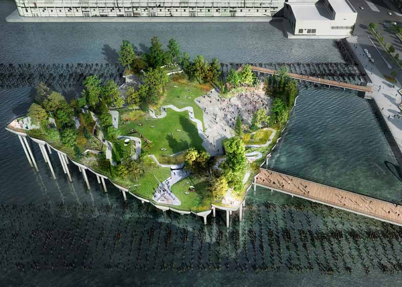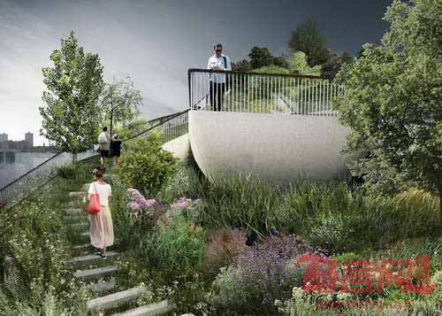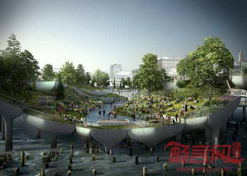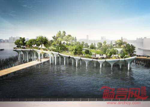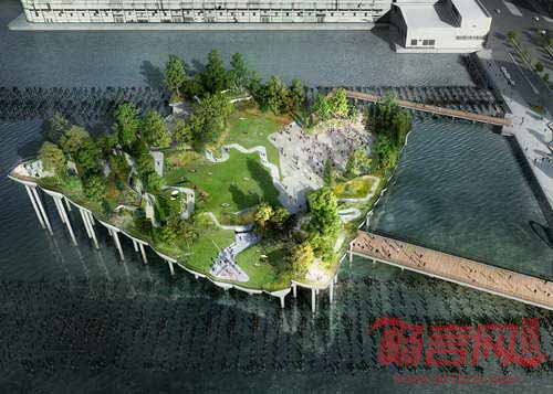 英国设计师Thomas Heatherwick完成了纽约哈德逊河漂浮岛公园的构想。根据计划,一万平米的55号码头奖取代失修的54号码头,结合表演设施和绿化植物,构成连贯完整的景致,在距离哈德逊河岸56米的位置建造若干蘑菇形状的柱子景观。