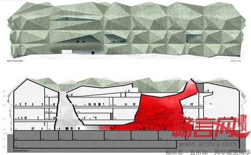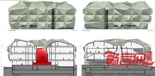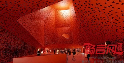 山峰一样的屋顶上还有一个巨大的天窗,自然光线可以从这里透入博物馆内部的一个红色大房间,这个房间占据了博物馆的整体4层高度。