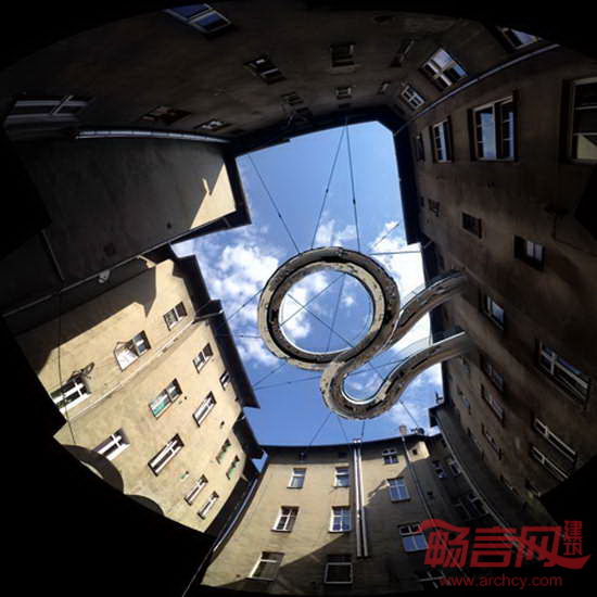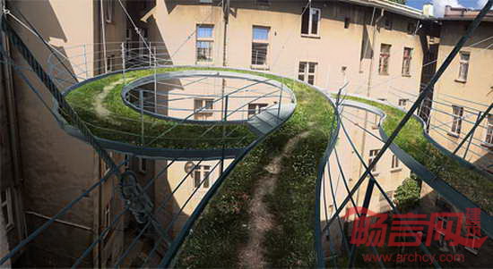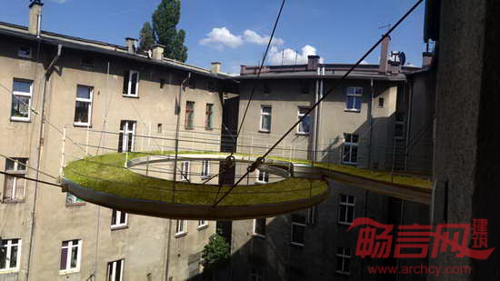 一成不变的视野令人厌烦,Zalewski建筑事务所为了改变这种状况,在工作室外添加了一个空中走道,这样不必离开建筑,就能惬意的休闲散心。事务所位于波兰南部的Gliwice,坐落于一座建筑的三层。在一个炎热的夏日,设计师面对无趣乏味的庭院,渴望创造一个舒适的户外空间。设计师构想出80厘米宽的走道,从一个窗户蜿蜒而出,沿着庭院方向回环,返回另一端。走道由系绳悬吊,邻近建筑的墙壁提供了支撑。