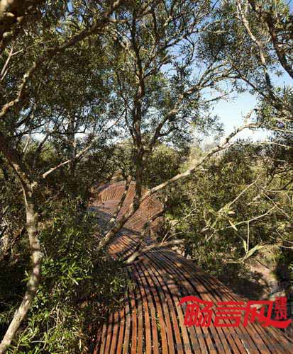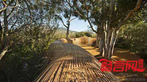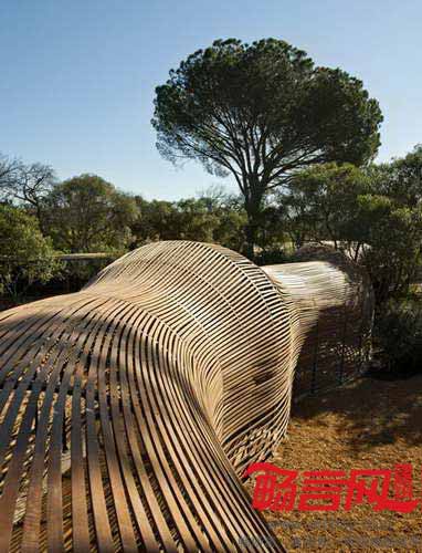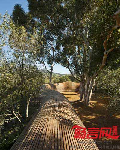 项目位于南非西开普省(Western Cape),用于农场中的花卉种植。蛇形的木质通道中间有一个凸起,如同被蛇吞下的鼠。