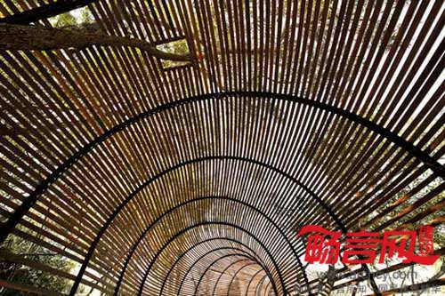 Babylonstoren农场中的鼓腹毒蛇景观由法国建筑师Patrice Taravella及设计师Terry de Waal设计,制作方法是在橄榄树和桉树之中的钢架上缠绕石榴木条。