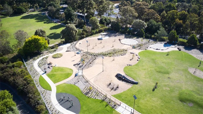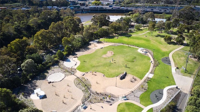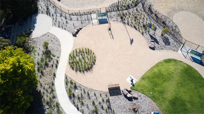 这一经过改造后的狗狗户外活动天堂拥有一系列特色设施,包括一个宽阔的草地游戏区、一处干涸的河床、坚固的石块,以及来自当地的家具设施,它的设计致敬了该地区的本土红桉树种,并巧妙地与附近雅拉河的环境相呼应。本地和本土植物品种与景观融为一体,设计师在安静的区域还贴心地覆盖了地膜,以鼓励低强度的活动。