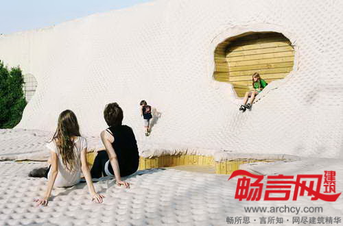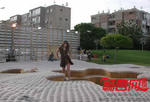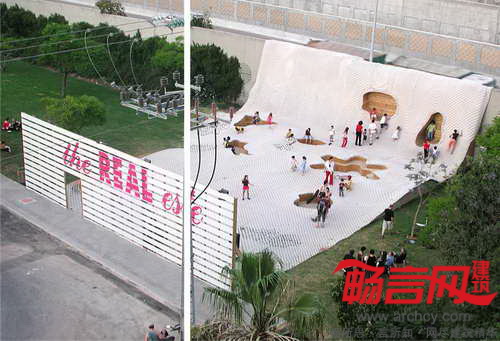 REAL临时公共空间占地550平米,位于以色列Bat-Yam市的高速路口边,空间设计旨在提供一个公共休闲空间。公园的外观类似一块带有凹洞的布面,使场地的所处边角状况大为改观。