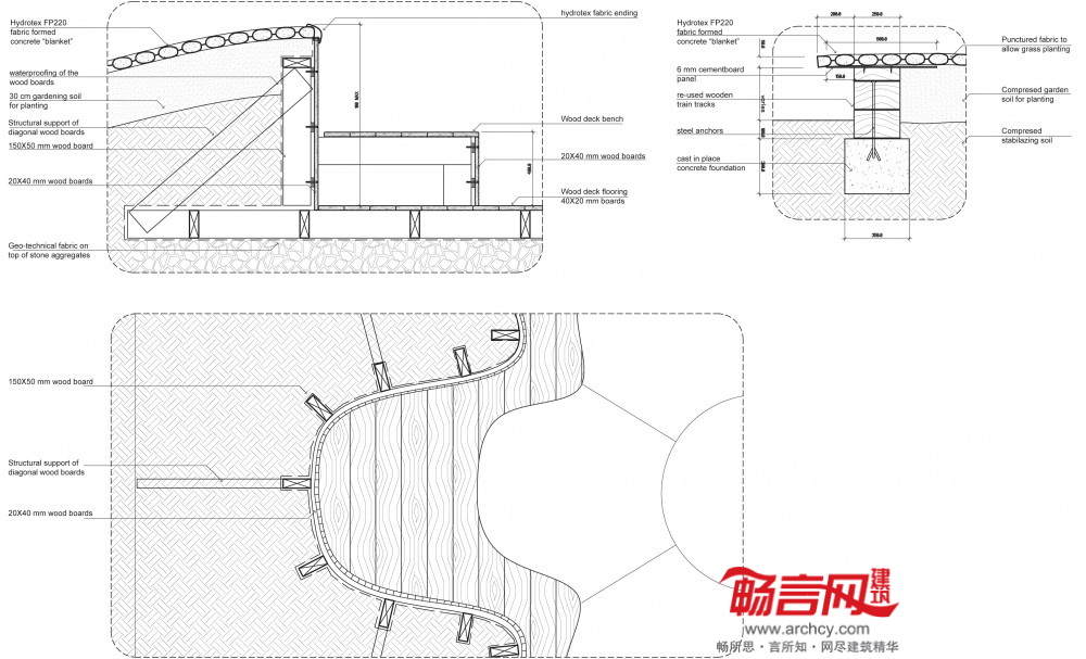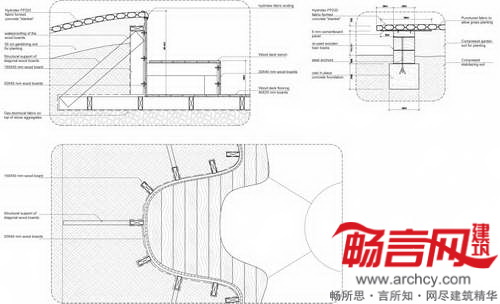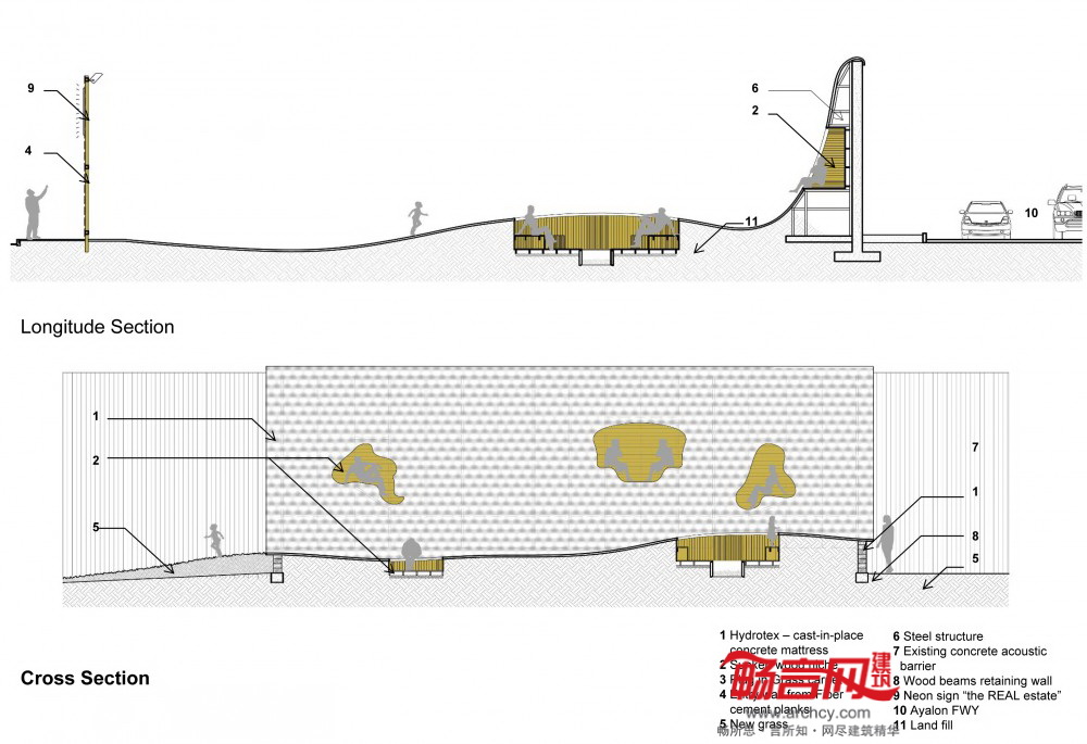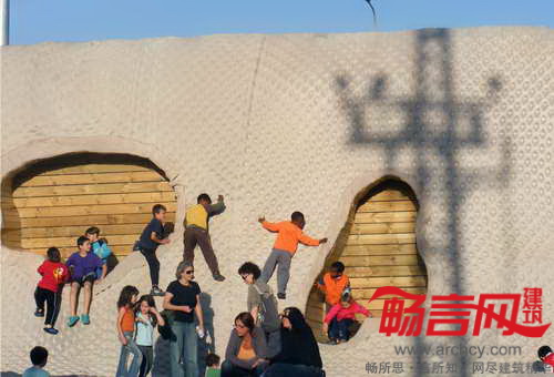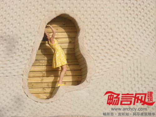 公园表面使用了一层连续的混凝土“毯”,一直延伸到噪音屏蔽墙上。公园的地面上有7个木质凹洞,凹洞形状和单人、双人或多人的轮廓相吻合。