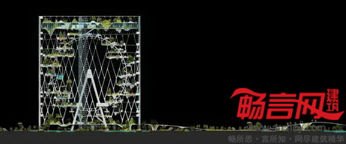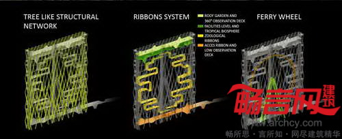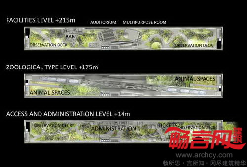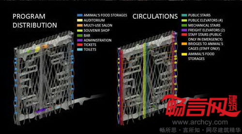 全世界的动物园设计都正在经历变化和发展。本项目的关键问题在于:如何使得布宜诺斯艾利斯垂直动物园真正成为通向自然世界的入口;展现多姿多彩的动物世界;鼓励游客用行动支持保护野生动物和生态系统。动物园设计灵感来自现代野外旅行。旅行过程中,人们可以观察、拍摄野生动物,穿越保护区。通常,游客可以驾驶自己的汽车,观察野生动物,而不是观看锁在笼中的动物。这个理念契合了现今流行的“浸入式展览”趋势:野生动物处在原本的自然环境中。设计师别出心裁地添加了一个利器:摩天轮,用于给人印象深刻的视觉观光体验。这是当下多个设计趋势主题,可以理解成融合了高楼、野生动物园和摩天轮的城市“灯塔”。摩天轮位于动物园的心脏地带,运行半圈需要30分钟,可谓相当缓慢。观光客达到最高点时,可稍作停留,有多种设施可供选择,包括教学项目、自助餐厅、礼品和纪念品店等等。