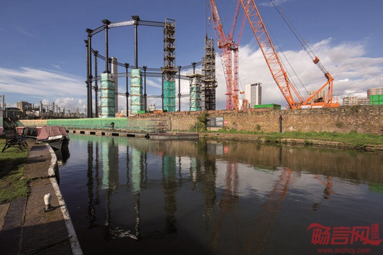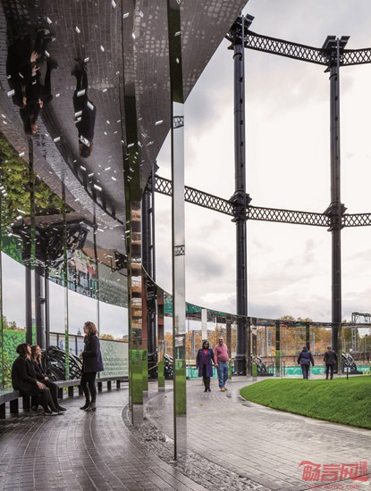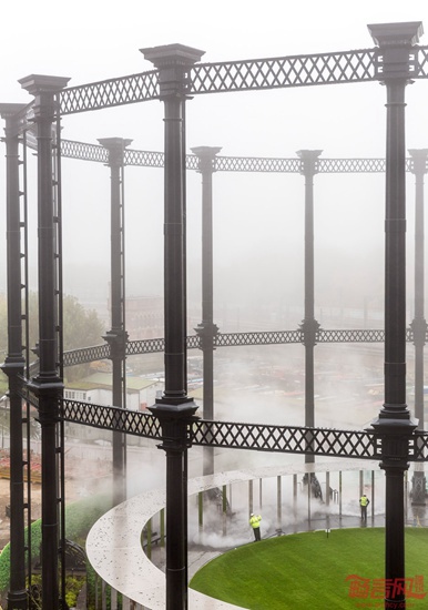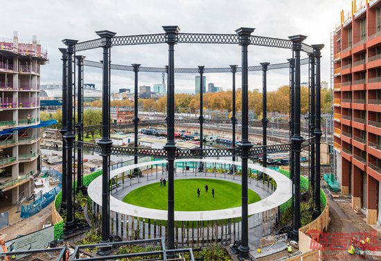BellPhilips工作室将伦敦一个维多利亚时期的储气罐改造成公园。项目属于国王车站更新工程的一部分,工作室是在2009年一次设计竞赛后取得该项目机遇的。目前该项目正在施工进行中,包含一个环形草坪和抛光钢架。环绕公园的筒形钢框就是八号储气罐,建造于1850年代。这个二级保护结构曾属于Pancras煤气公司,在2000年遭到弃用。