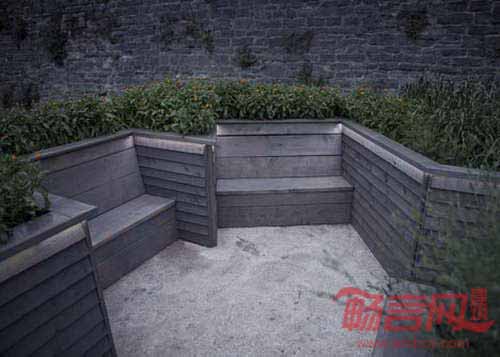 花坛位于花园两侧,中间的道路将此前驳船装载种子的船舱遮挡起来。
