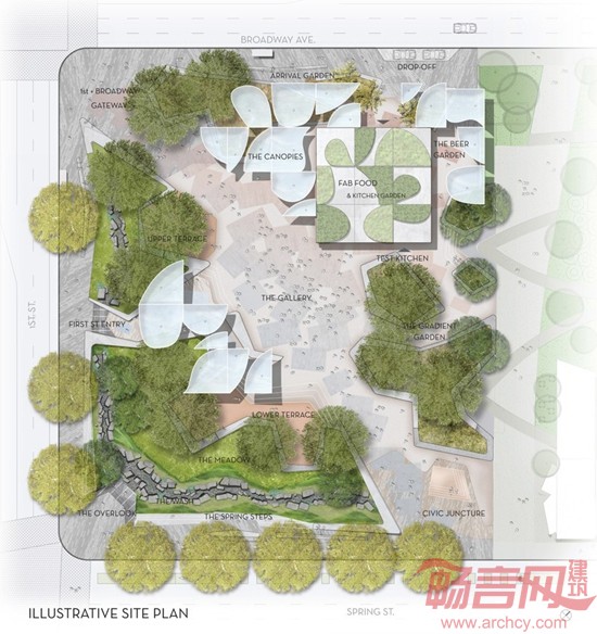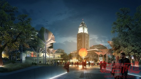 项目地块目前处于闲置状态,建设该项目旨在为洛杉矶市区提供一个能够进行艺术、饮食和交流等活动的多功能绿色空间。OMA将公园设计为一个中央广场,并配备了形象而有趣的雕刻般的反光顶棚,在提供阴凉的同时也增强光线。此外,公园里还种植了橡树和美国梧桐树。公园里的座位墙呈曲线布置,犹如一条起伏的彩带。