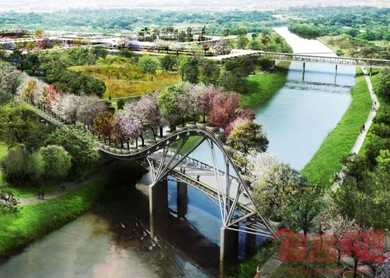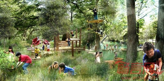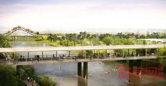 沿着现有的道路,将建设步行道和自行车道,并且与城市道路系统相连。一座顶部栽满树木的拱桥将横跨Bayou河。