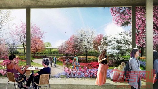 荷兰景观公司West 8为美国德克萨斯州的休斯敦市规划设计了一个植物园,该植物园布置犹如马赛克花式拼接一般,并且有一个栽满色彩鲜艳的大树的拱桥。