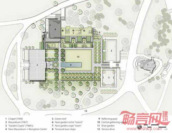 有着142年历史的莱克伍德公墓曾面临着一个挑战:如何在一个受人尊敬的地标式的环境中创造出一个具有纪念性的属于21世纪的空间。花园陵园项目正好巧妙地、持久地、优雅地迎接了这个挑战。这个景观涵盖了朝南斜坡上三分之二的建筑,建筑风格展现了一幅空旷的、和平的风景,伴着静静的倒影池、本地树木构成的小树林以及沉思的壁龛——鲜明的当代设计与它的历史环境和谐地融为一体。