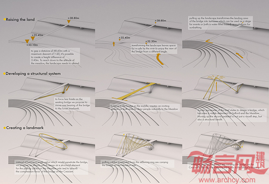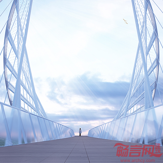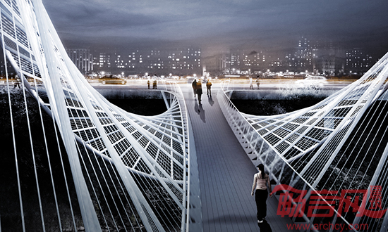 设计师Alex Daxbock和Chris Precht为英国Salford桥设计竞赛提交了设计方案。方案中,从桥的一侧来看,桥体结构就是一个普通的拉索桥结构,但是当你走近桥的入口处,就会发现一个巨大的椭圆形结构。