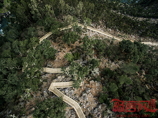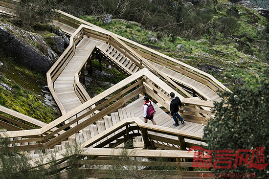 这并不是一条普通的走廊那么简单。设计过程中,尽可能地减少了走廊建筑对周围环境的影响。阶梯盘山而上,人们可以从山顶将周围景色尽收眼底。一条很窄的木桥横跨派瓦河,周围是陡峭的崖壁和郁郁葱葱的植物。整条走廊依地势而建,中间设有许多休息站和观景台。