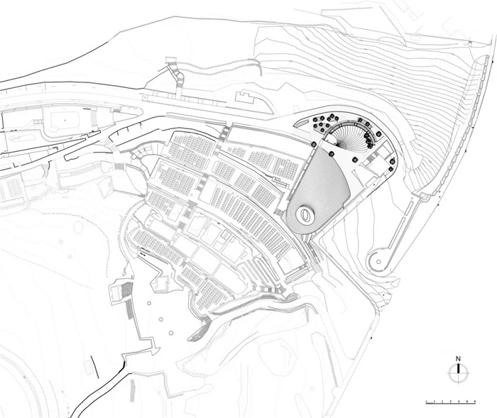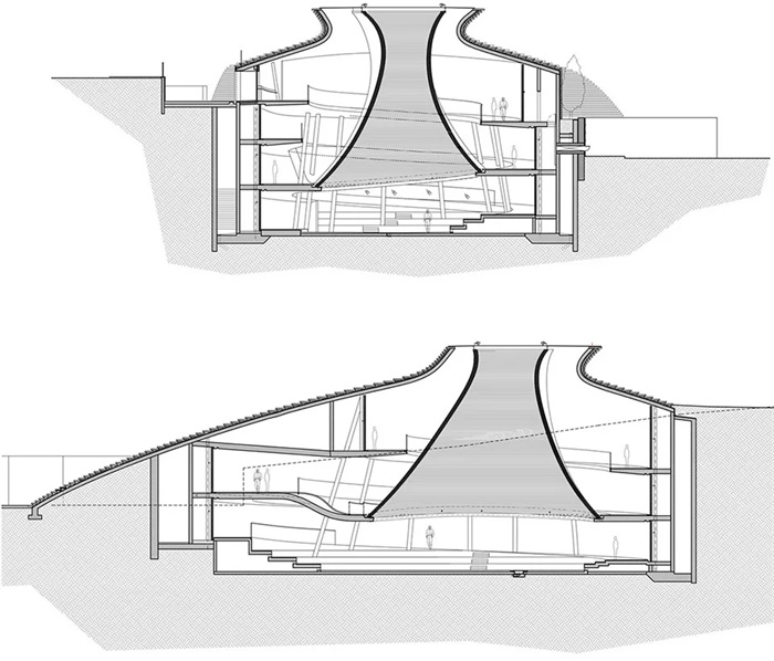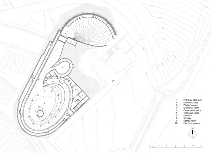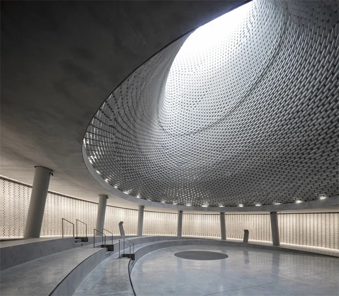 在纪念馆上方,耶路撒冷石塑造出新的弧形山体,同时,起伏的砖面构成了漏斗状的穹顶,将下方的大厅与天空相连。不规则的旋涡形状使空间内部充斥着持续变化的自然光。屋顶的上端铺设以间隔的石板,使空气和自然风得以穿过。
