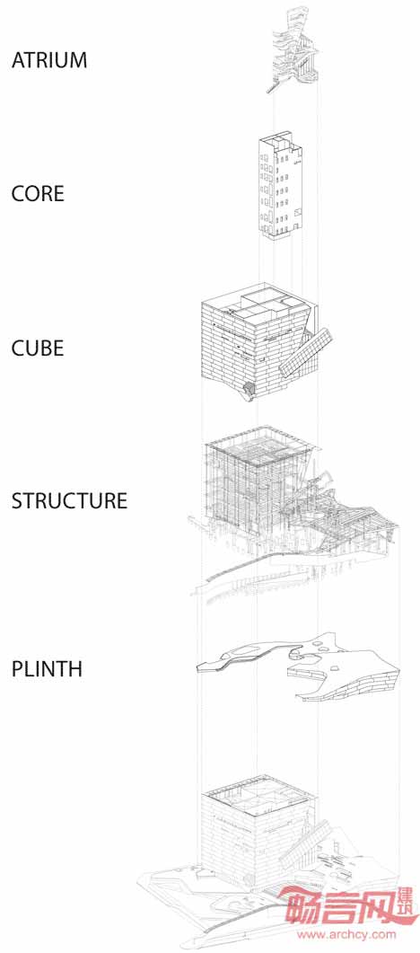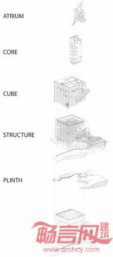 电梯外壁采用了玻璃质地,斜斜地设置在在条纹混凝土立面上,继而拐入建筑内部空间中。游客在建筑顶部可以饱览城市的风光,然后乘坐电梯,来到下方五层展区,最后抵达中庭。