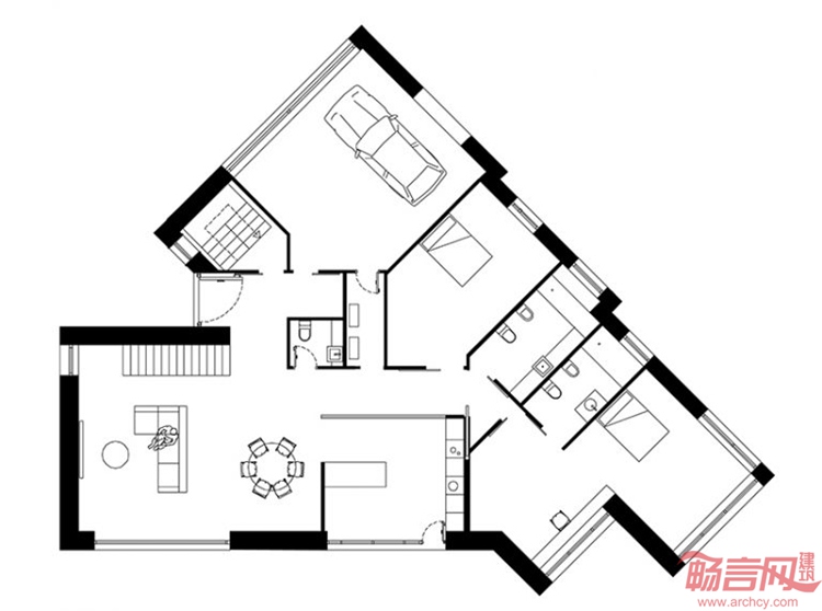 VMS住宅由Marcos Miguelez设计,坐落于一块三角形场地上,周围是综合用地,临近西班牙Leon城郊。场地一侧毗邻小果园,另一边靠近土路,正面朝向一条街道。建筑根据场地条件调整了几何造型,是一座外表大胆的石材建筑。项目采用西班牙传承百年的传统石砌工艺,坚定地保护了室内空间。