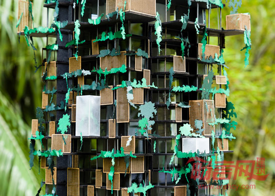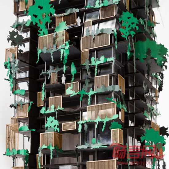 大楼设计高度为150米,根据设计模型来看,大楼阳台上布满了绿色植被,幕帘从阳台上伸出。