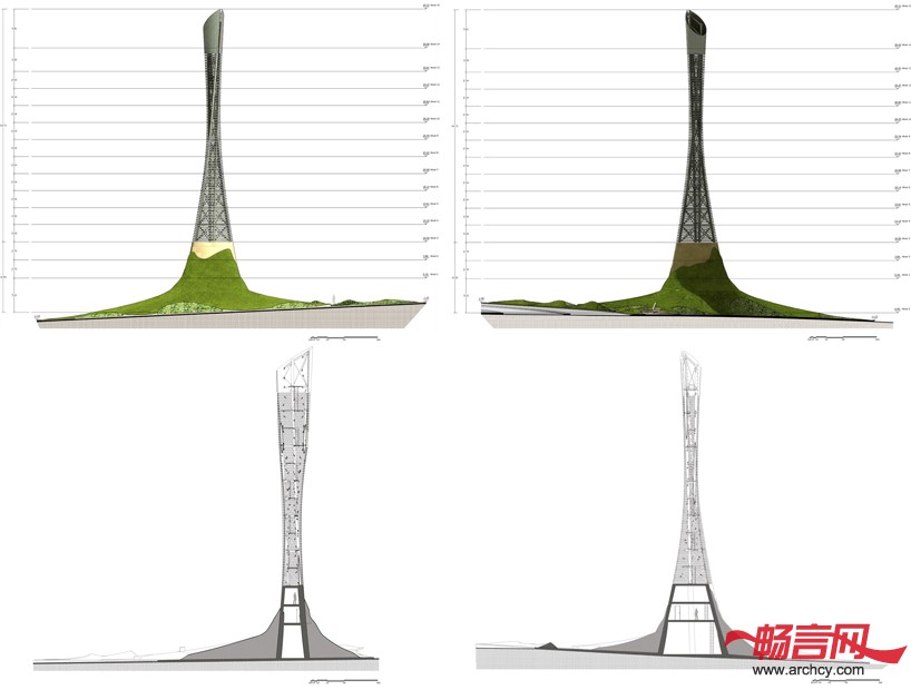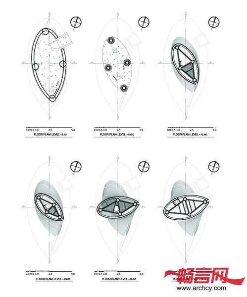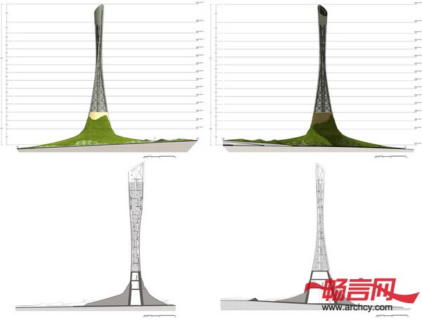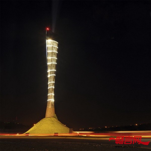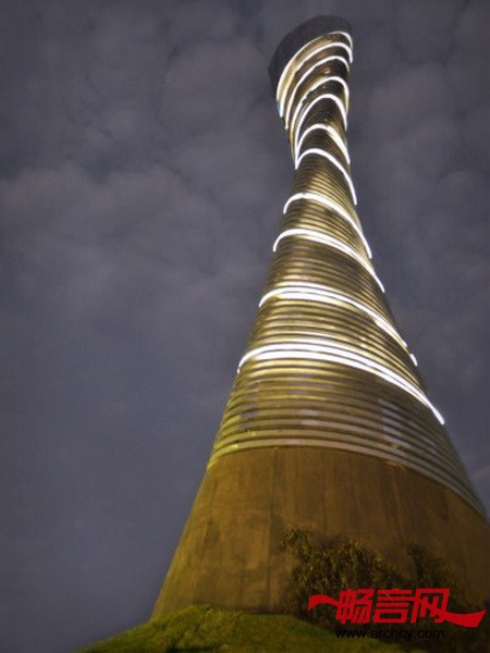 火炬大厦的底部是一个十米的混凝土空间,再往上就是由100个环组成的35米高的钢结构部分,楼里面有一百个空房间,当阴影投射在它上面时,这些空间就好像光学底片一样。夜晚来临的时候,火炬大厦就仿若一座灯塔,无论是楼体还是楼上的环形“伤疤”,都会将周围照亮。
