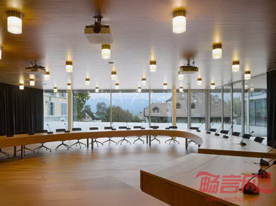 Personeni Raffaele Schaerer建筑事务所完成了瑞士Bernex市政厅设计。城市邻近日内瓦,是一个新兴的城市中心。建筑和场地原有建筑共同构成了可举办正式仪式、集市和节日庆祝的公共广场。方案与面北的坡地相互融合,包含三层同户外空间直接相连的楼层。每个楼层均设有落地窗,为室内提供一览无余的视野。除了行政区域,市政厅涵盖会议室、档案室和展示区。