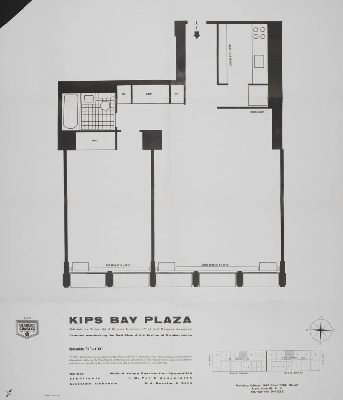 「Kips Bay Towers」位于美国纽约曼哈顿东侧,占地约 4 万平方米,介于 30 街至 33 街、第一大道至第二大道之间。项目包括两栋分别建在地块南北两侧21 层的长条形住宅塔楼,共有 1,160 套公寓,每栋楼 560 套,每层 28 套。