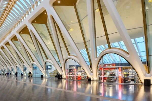 车站整体以强烈节奏感的结构肋骨为核心构成,屋顶采用大跨度钢结构与玻璃覆盖系统,形成轻盈、连续的空间体系,覆盖多条轨道与站台区域。屋顶自城市一侧延展至轨道上方,白色钢肋以纵向节奏排列,既承担结构支撑,又构成建筑的主要视觉语言,赋予车站通透、明快而富有秩序的空间特征。