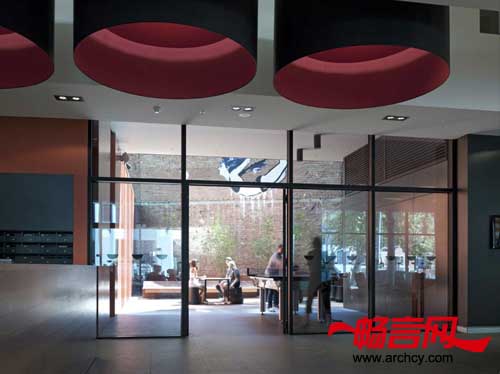 整层高的玻璃窗使每间卧室更有空间感,而玻璃也分成了两部分,即固定的透明玻璃和可以调节的彩色玻璃。明亮多彩的玻璃是根据周围的特色而特别设计并安装的,它喻意着及学生时代喷薄的青春与多彩的生活。