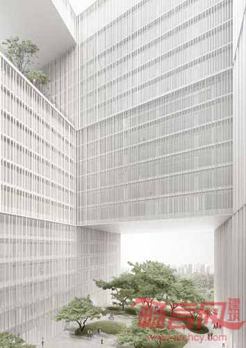 建筑低层设有中庭,同时创造了挑高的石质基底,构成了开放式平台。外立面赋有表现力,包含第二层铝制表皮,覆盖了落地玻璃窗。