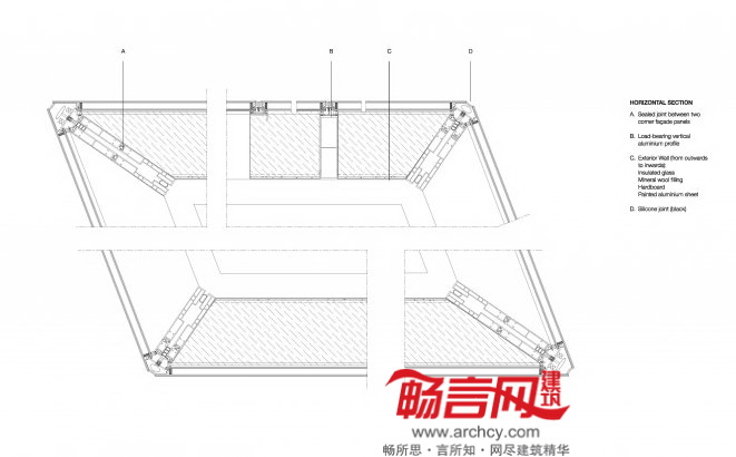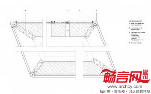 大楼底层包含餐厅,会议区及其他区域。大楼平行六边主体上部有个立方体,因而上部楼层往外凸出。外立面的显著特征是金属色的三角形窗格玻璃,其中包含的8种不规则形状的玻璃任意地排列在外墙表面,人们不会发现有任何规则的图形。窗格使用了薄层金属氧化物,满足建筑的隔热和遮阴要求。