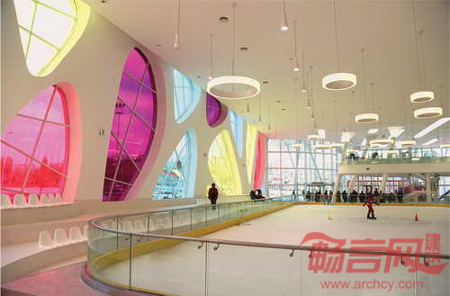 楼上咖啡馆顾客可以欣赏冰面活动,休息室容纳了公共功能,可举行多种社会活动。