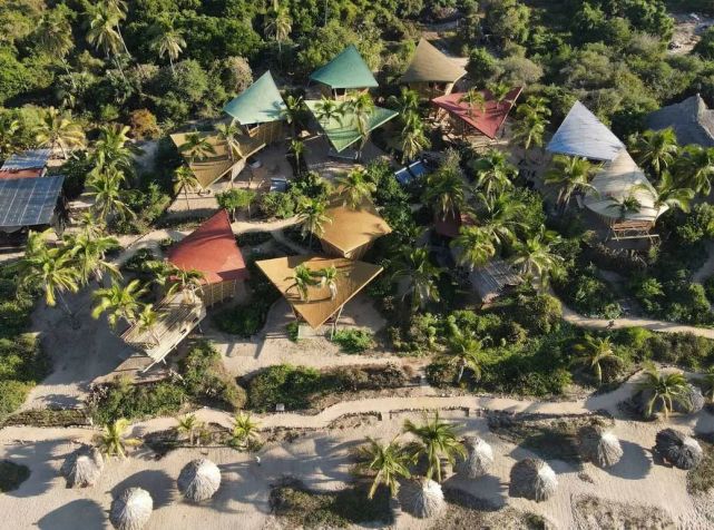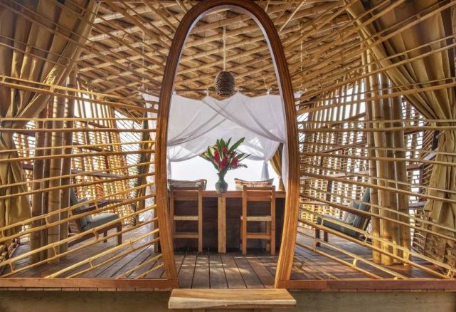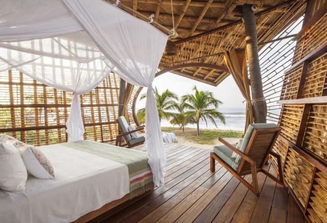 树屋坐落在地面之上,周围环绕着椰子树,俯瞰海滩和海浪。每个树屋都有大屋檐,就像一把大伞,为强烈的阳光提供遮荫并防止大雨,而立面百叶窗则允许自然交叉通风。