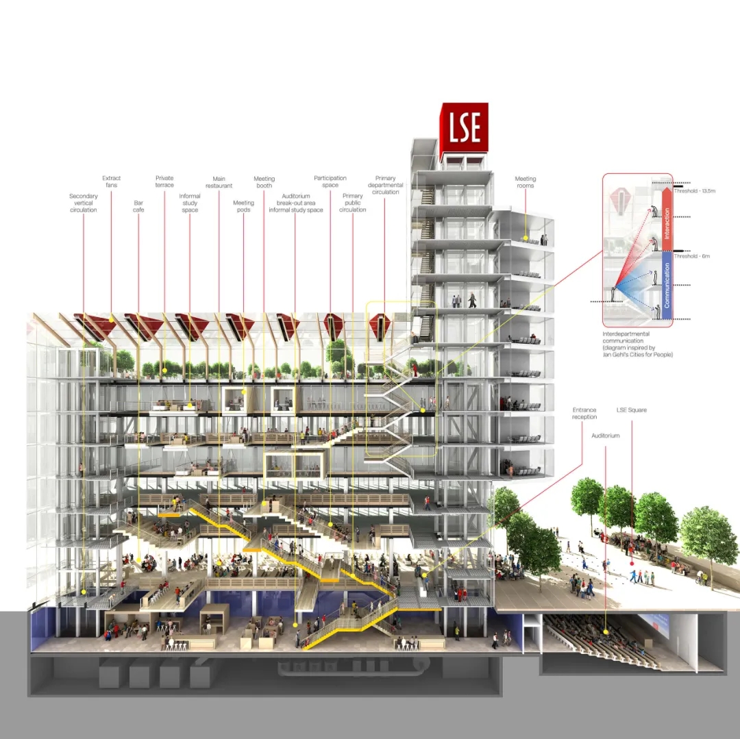Rogers Stirk Harbour + Partners(RSHP)设计了这座反映伦敦政治经济学院价值观的建筑。该项目达到建筑可持续评级系统BREEAM的最高级别“卓越”级(Outstanding),达成了设计任务书设置的目标。项目提供了创新且有启发的教学空间,包括一个新的“伦敦政治经济学院风格”的讲座厅,并提供院系空间以鼓励院系间的合作交流。